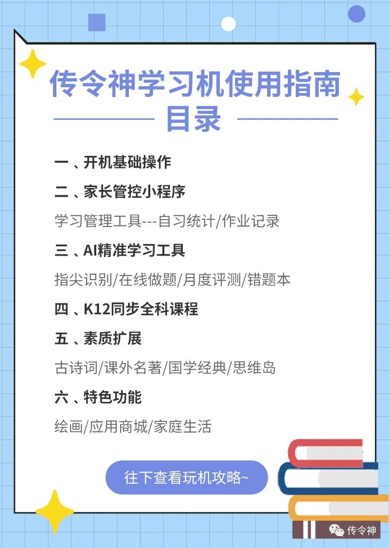 关注“传令神”公众号,点击“家长管控”进入小程序,家长便可远程监控学习机的使用情况啦。小程序里有自习统计、作业记录等几大功能模块,一起来看看吧。